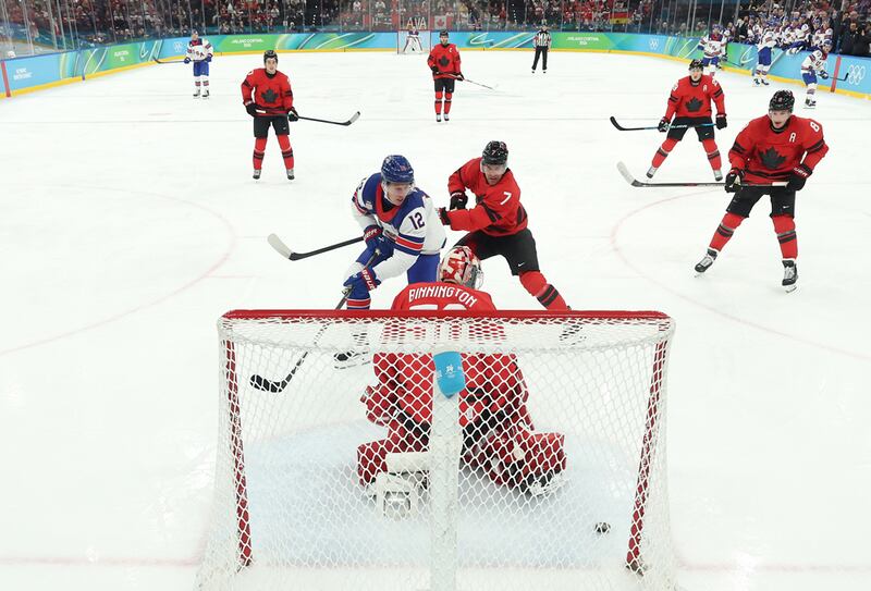 Ice Hockey - Milano Cortina 2026 Winter Olympics: Day 16 MILAN, ITALY - FEBRUARY 22: (EDITOR’S NOTE: Image was captured using a remote netcam.) Devon Toews #7 and Jordan Binnington #50 of Team Canada defend the net against Matthew Tkachuk #19 of Team United States in overtime during the Men's Gold Medal match between Canada and the United States on day 16 of the Milano Cortina 2026 Winter Olympic games at Milano Santagiulia Ice Hockey Arena on February 22, 2026 in Milan, Italy. (Photo by Bruce Bennett/Getty Images) (Bruce Bennett/Getty Images)