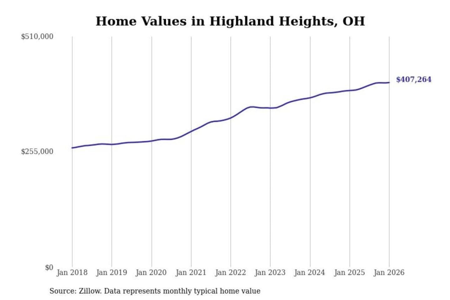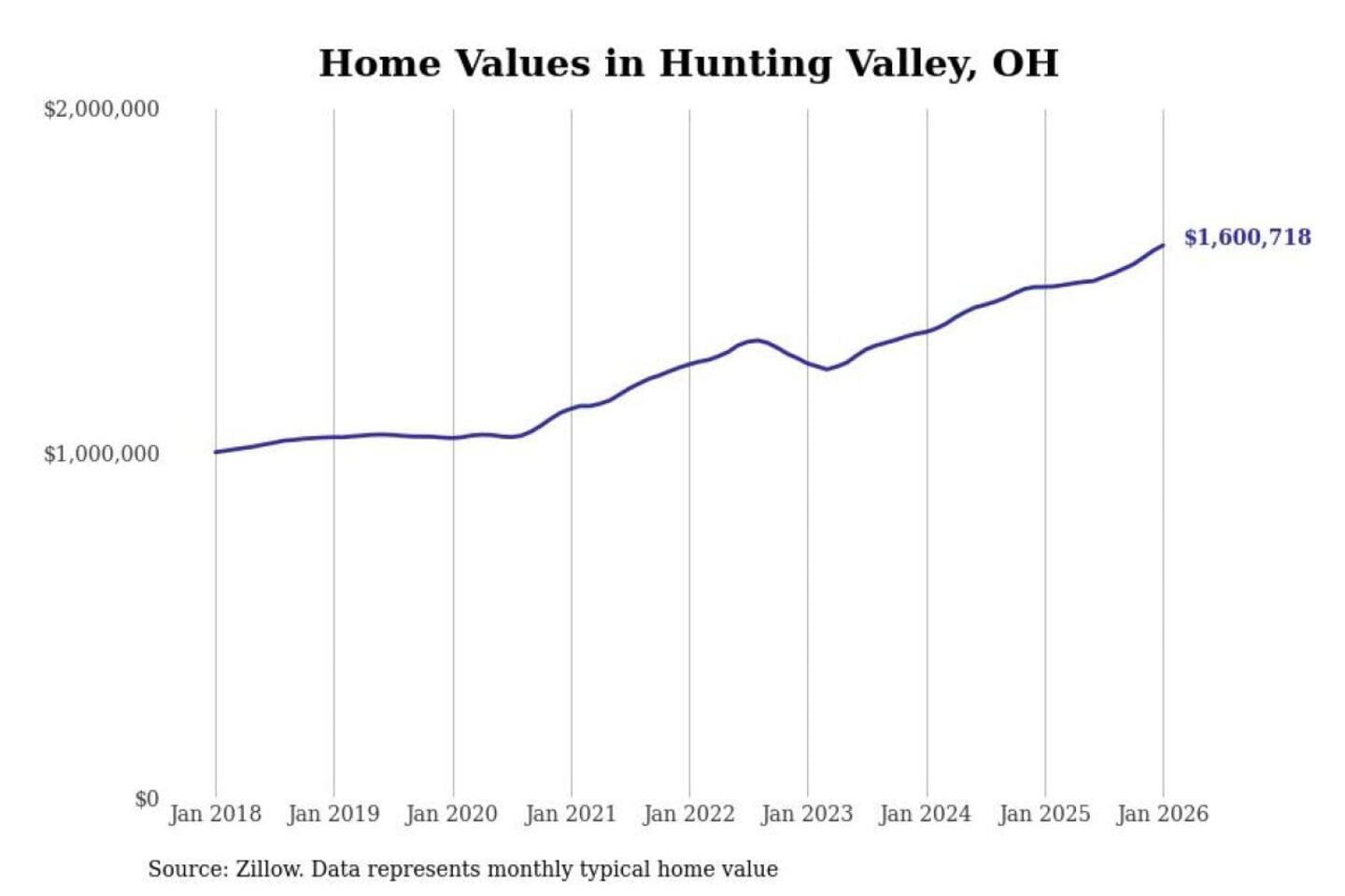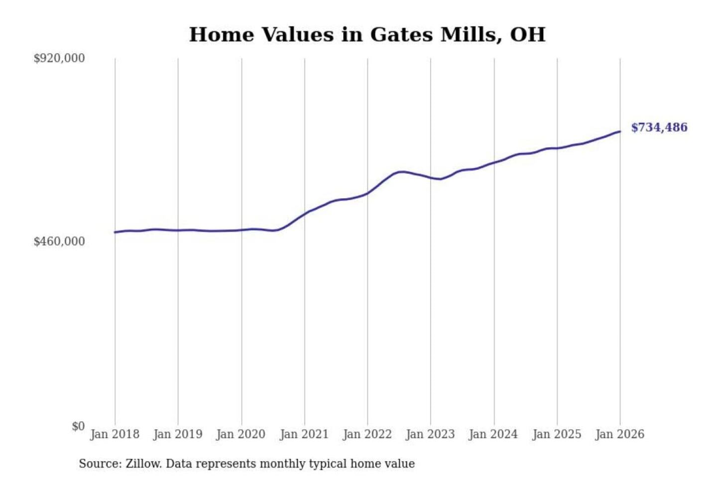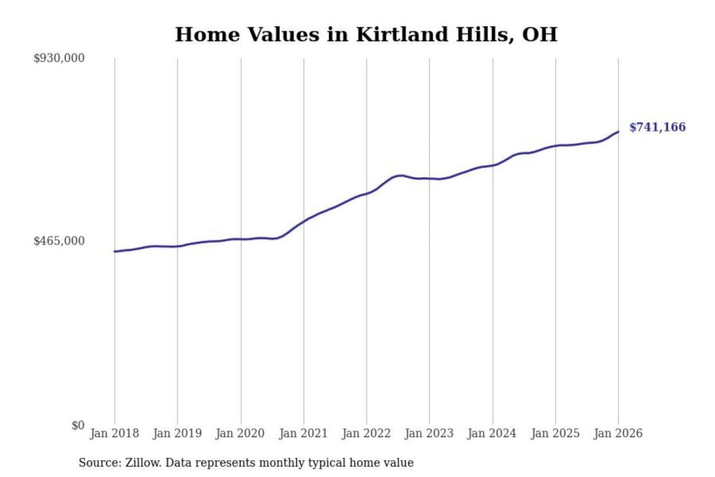 Stacker compiled a list of cities with the most expensive homes in the Cleveland-Elyria, OH metro area using data from Zillow. Charts show the monthly typical home value since January 2018.