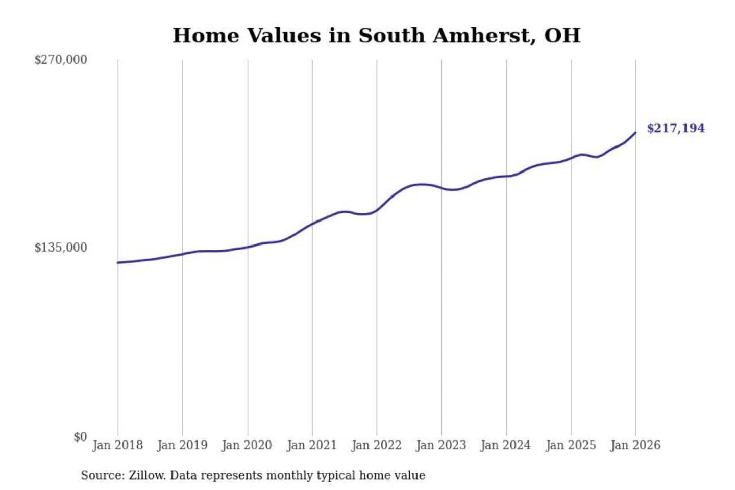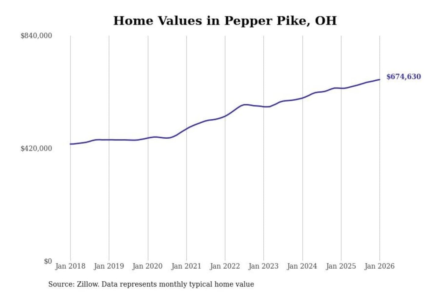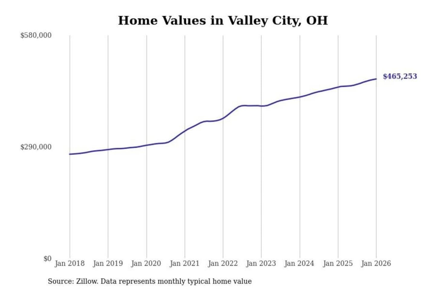 Stacker compiled a list of cities with the most expensive homes in the Cleveland-Elyria, OH metro area using data from Zillow. Charts show the monthly typical home value since January 2018.