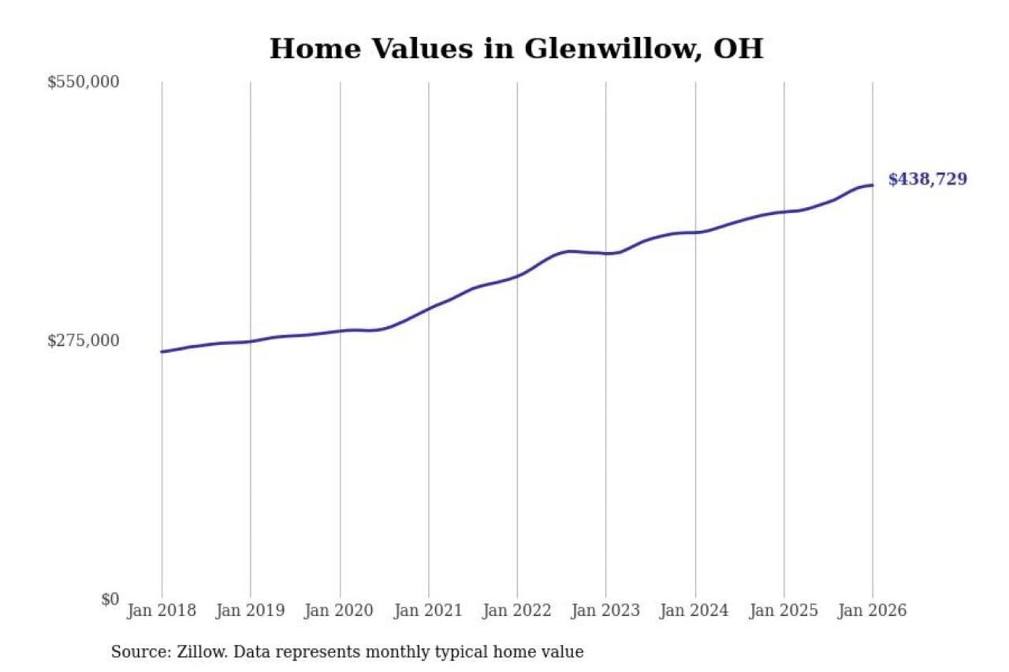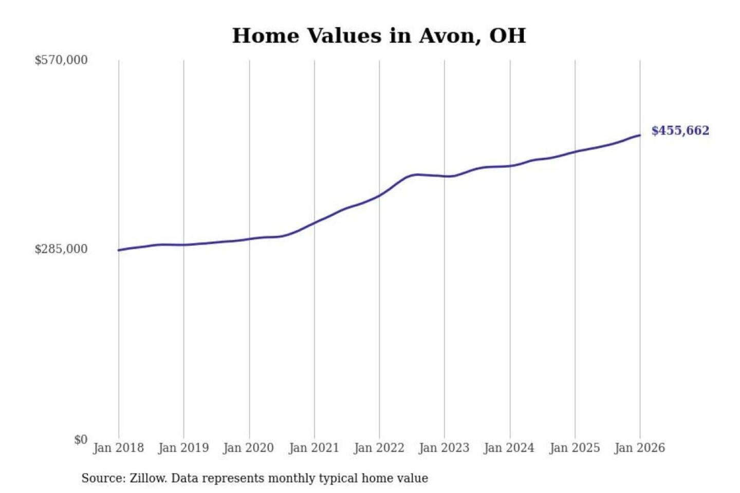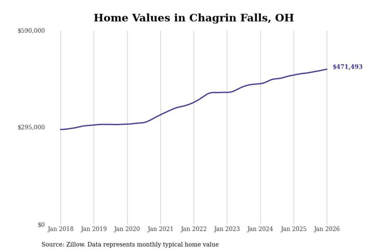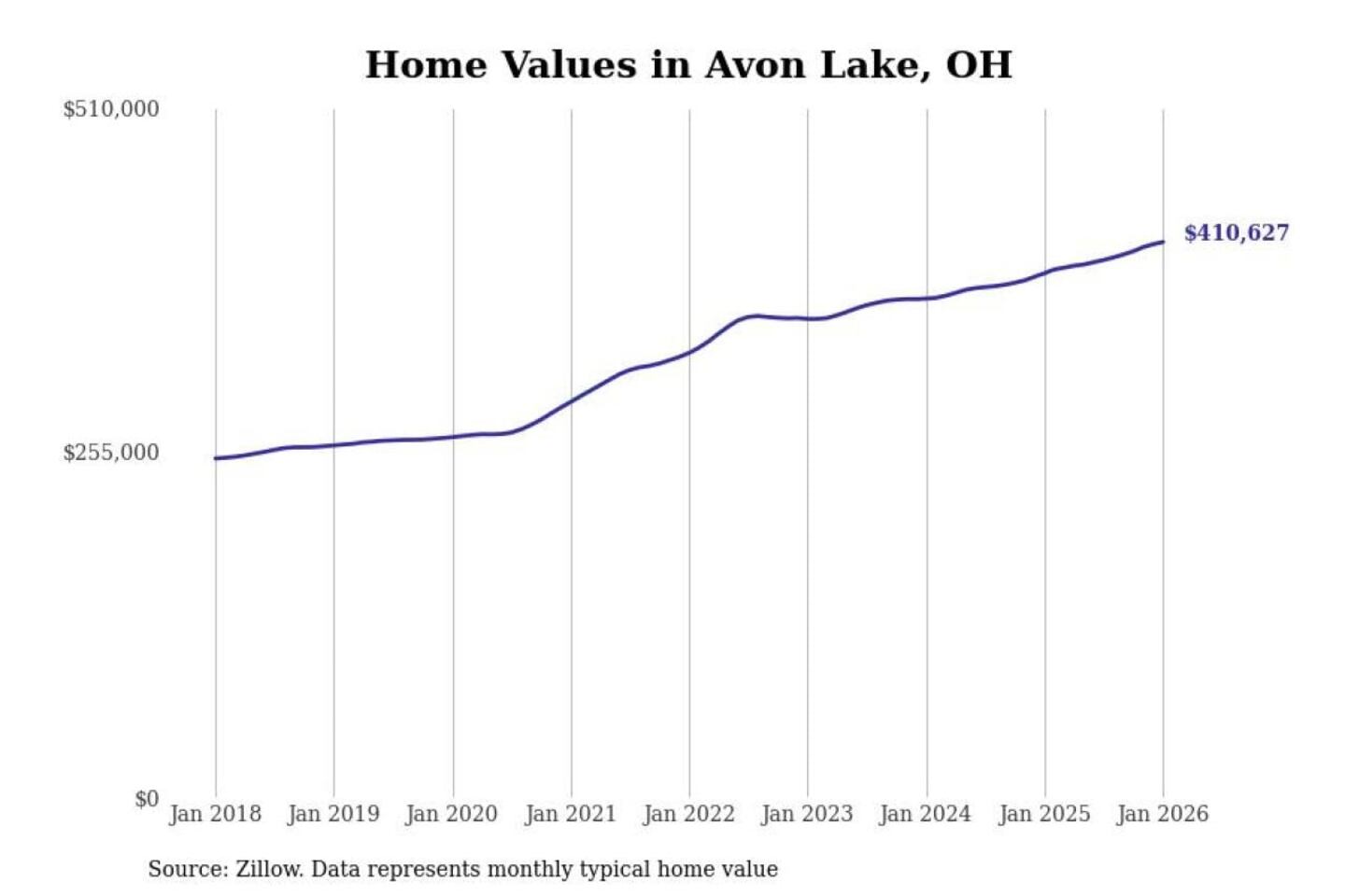 Stacker compiled a list of cities with the most expensive homes in the Cleveland-Elyria, OH metro area using data from Zillow. Charts show the monthly typical home value since January 2018.