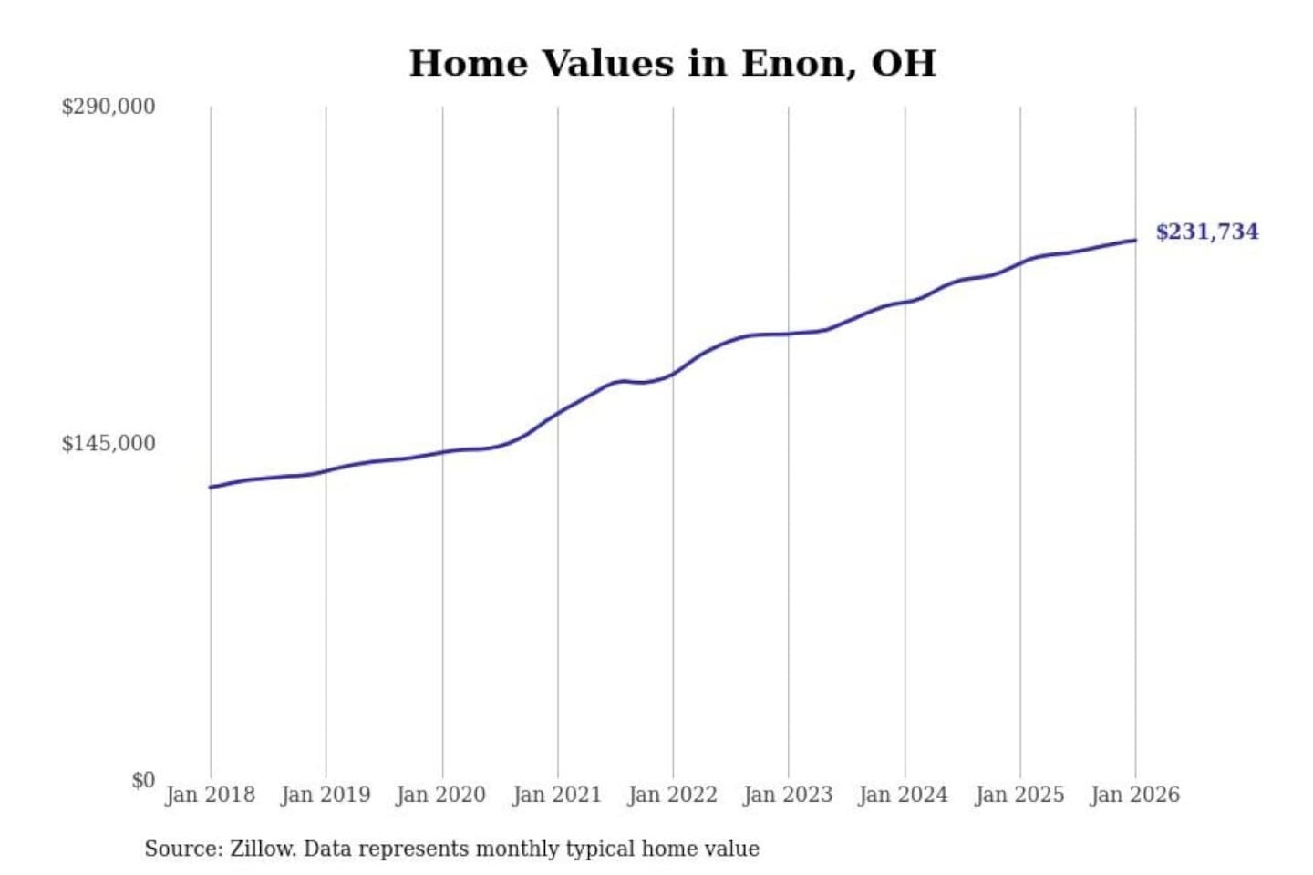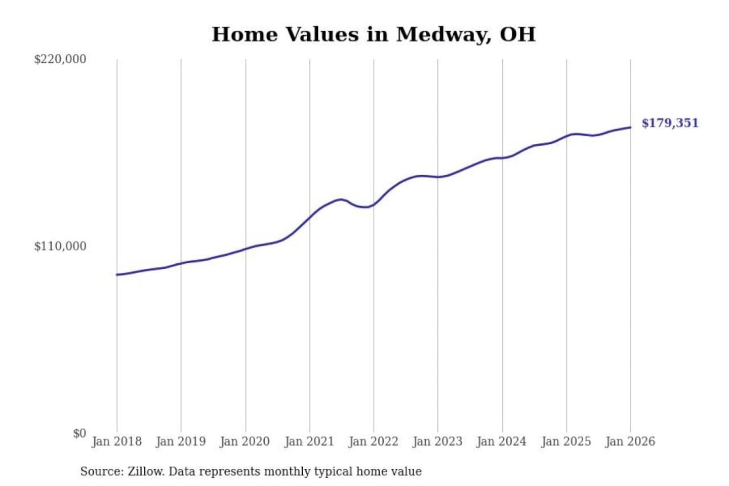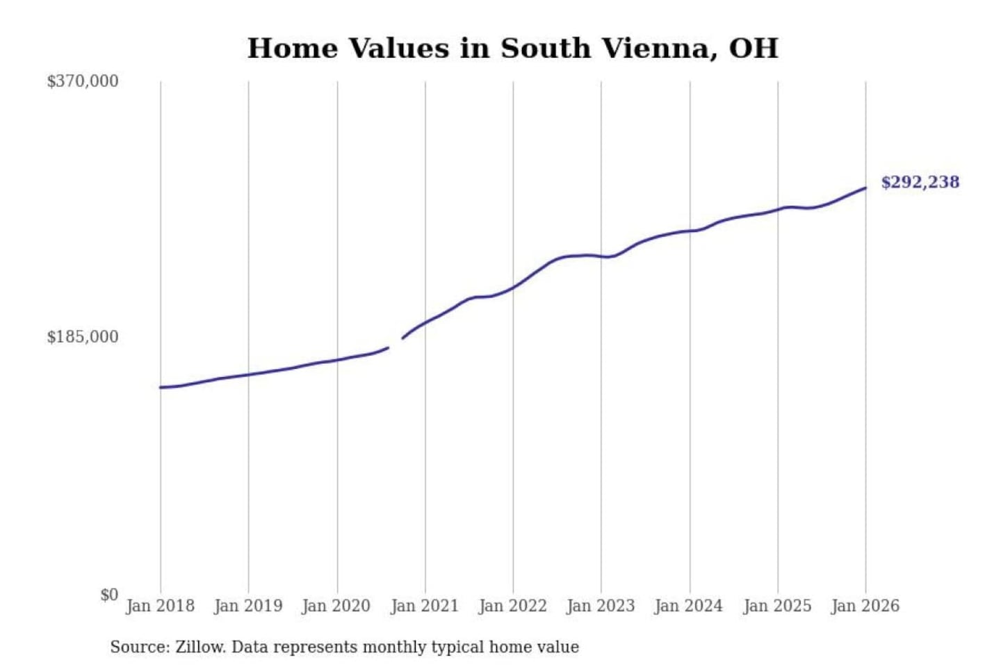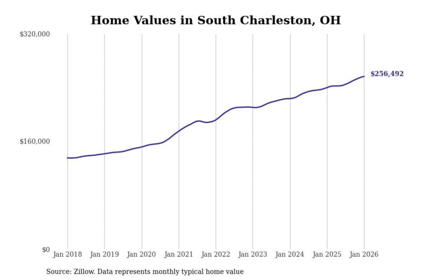 Stacker compiled a list of cities with the most expensive homes in the Springfield, OH metro area using data from Zillow. Charts show the monthly typical home value since January 2018.