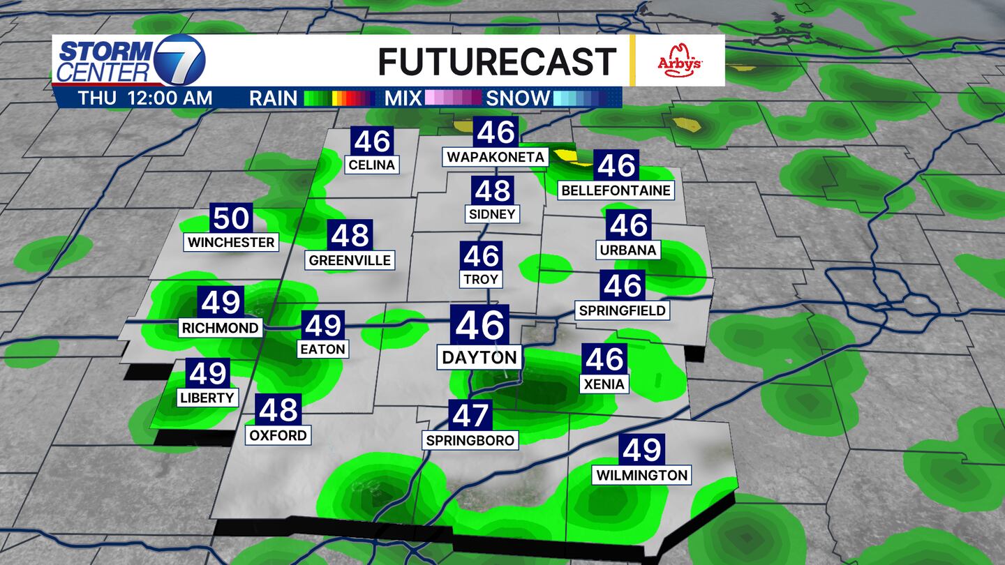 A few rain showers, and perhaps a rumble of thunder, will move through tonight as well. Rain totals from this will be less than 0.25″ as temperatures start in the middle 40s around Midnight and climb into the low 50s by mid-morning Thursday.