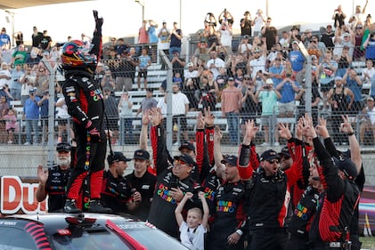 NASCAR Cup Series DuraMax Grand Prix Powered by RelaDyne AUSTIN, TEXAS - MARCH 01: Tyler Reddick, driver of the #45 Chumba Casino Toyota, celebrates with his crew and son, Beau Reddick after winning his third race in a row to start the 2026 NASCAR season winning the NASCAR Cup Series DuraMax Grand Prix Powered by RelaDyne at Circuit of The Americas on March 01, 2026 in Austin, Texas. (Photo by Logan Riely/Getty Images) (Logan Riely/Getty Images)