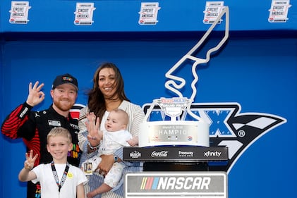 NASCAR Cup Series DuraMax Grand Prix Powered by RelaDyne AUSTIN, TEXAS - MARCH 01: Tyler Reddick, driver of the #45 Chumba Casino Toyota, celebrates with his wife, Alexa De Leon and sons, Beau Reddick (L)and Rookie George Reddick in victory lane after winning his third race in a row to start the 2026 NASCAR season winning the NASCAR Cup Series DuraMax Grand Prix Powered by RelaDyne at Circuit of The Americas on March 01, 2026 in Austin, Texas. (Photo by Logan Riely/Getty Images) (Logan Riely/Getty Images)