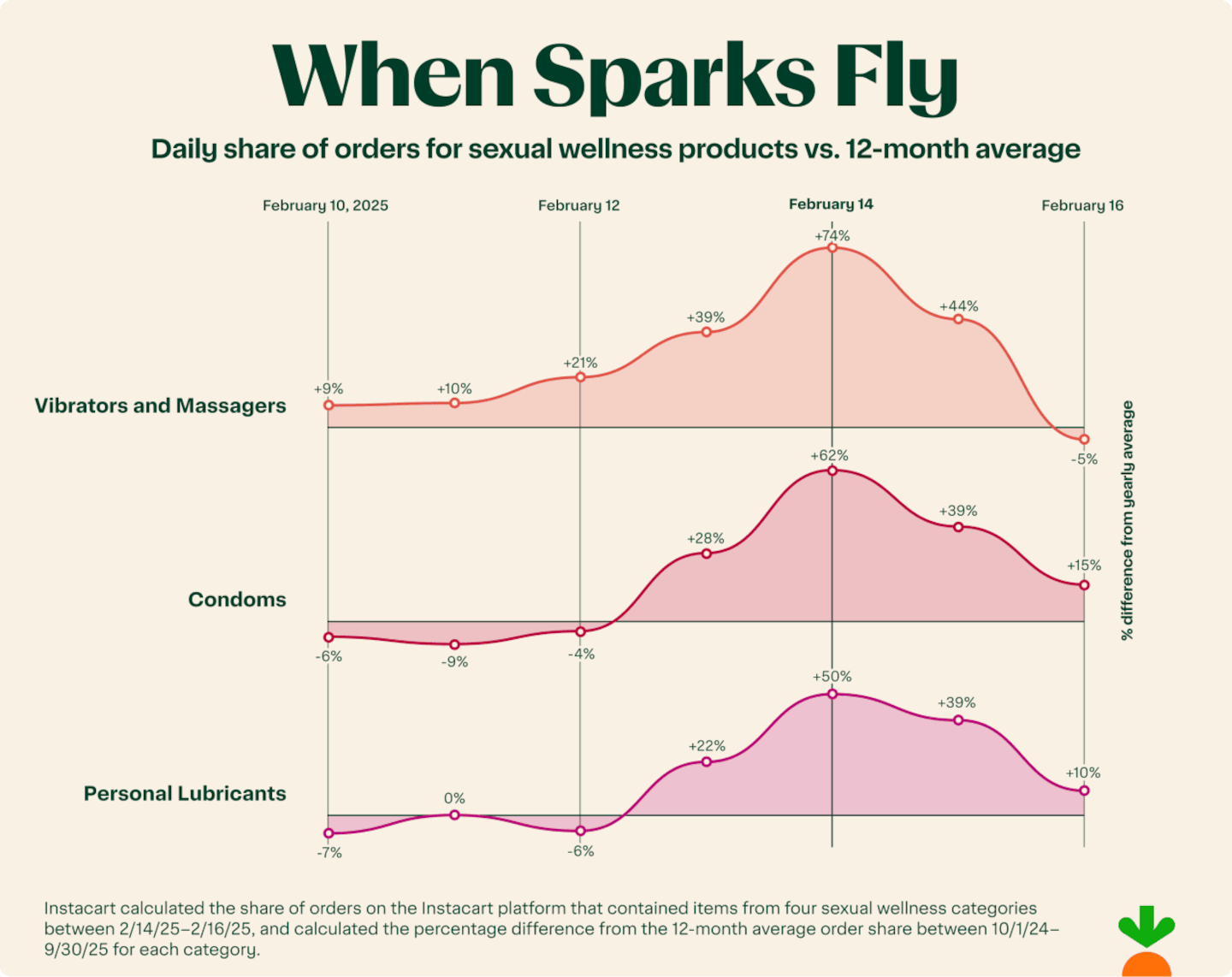 - Valentine's Day sparks more than flowers and candy. Orders for sexual wellness essentials peaked sharply on February 14, including Vibrators and Massagers (+74%), Condoms (+62%), and Personal Lubricants (+50%), underscoring the holiday's uniquely concentrated, occasion-driven shopping behavior.
