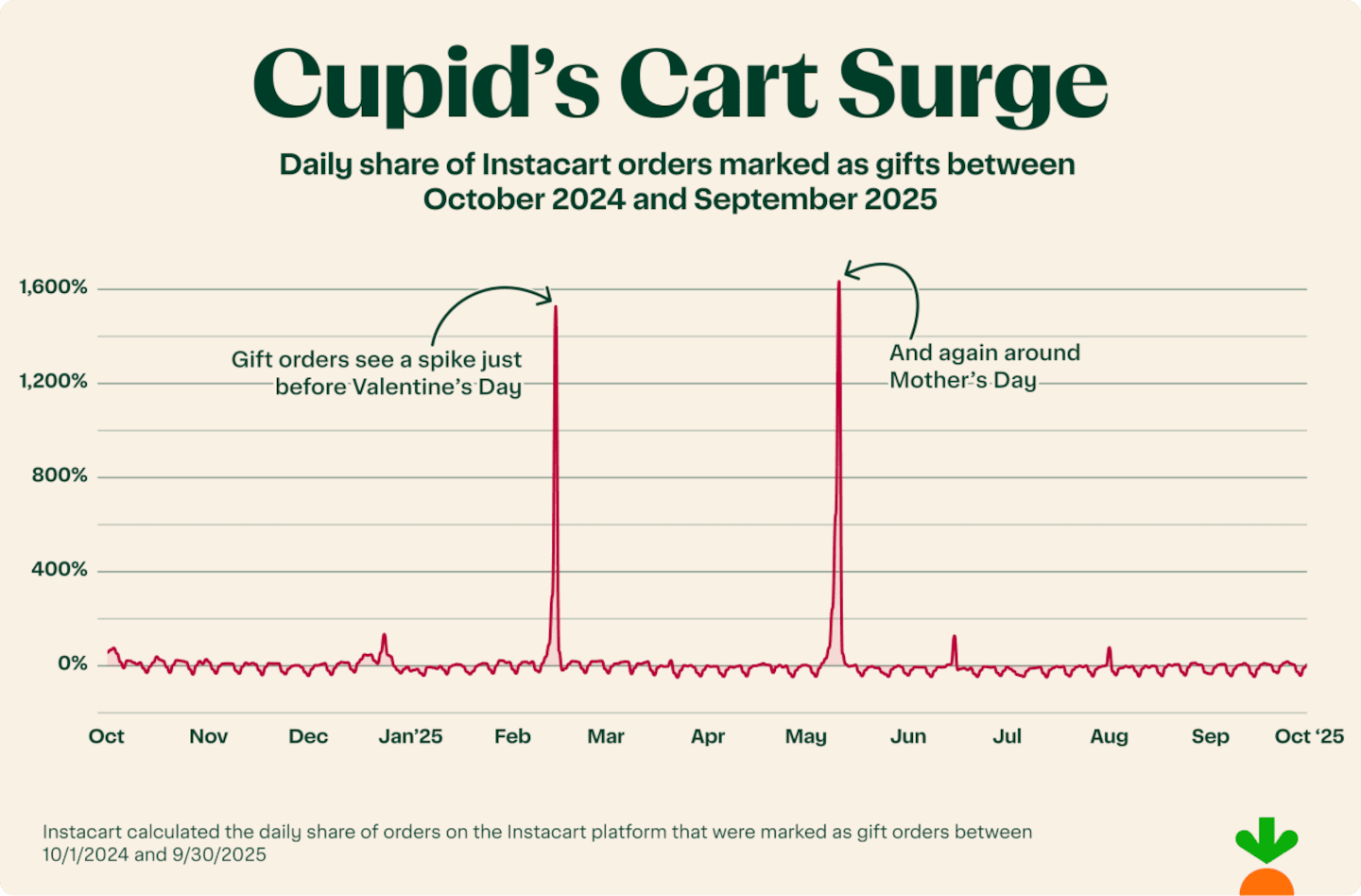 When it comes to gifting on the Instacart platform, Valentine's Day stands in a league of its own. Based on 2025 purchase data, Valentine's Day was one of the top two gifting days of the entire year – second only to Mother's Day (hi, Mom!).