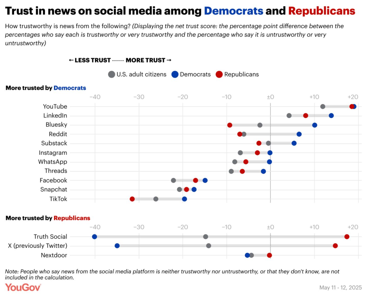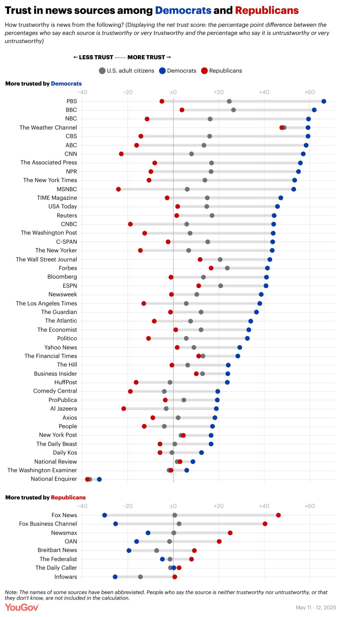 Like in last year's survey, YouGov asked Americans in 2025 whether they find news from each of 52 outlets very trustworthy, trustworthy, untrustworthy, very untrustworthy, or neither trustworthy nor untrustworthy. Using these results, researchers calculated each outlet's net trust score — that is, how much more likely Americans are to say the outlet's news is trustworthy or very trustworthy than untrustworthy or very untrustworthy.